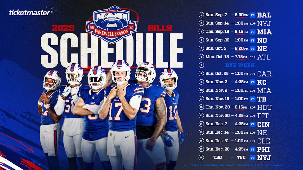 Bills akan memulai musim reguler 2025 pada 7 September melawan Baltimore Ravens dalam pertandingan Sunday Night Football. Jadwal lengkap mereka mencakup pertandingan melawan tim-tim kuat seperti Kansas City Chiefs dan Philadelphia Eagles.